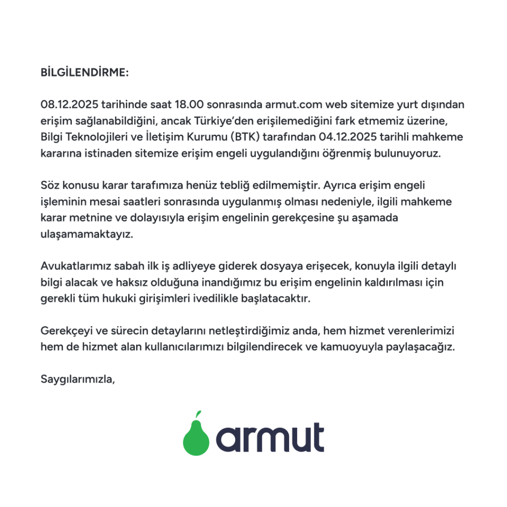 Konuyla ilgili açıklama yapan Armut yetkilileri, sürecin kendilerine tebliğ edilmeden yürütüldüğünü belirtti. Şirket yönetimi, kararı kullanıcılar gibi BTK sisteminden öğrendiklerini ifade ederek şu değerlendirmede bulundu: